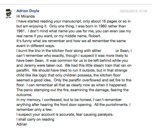The first lie and my brother, Sean, is beaten for burning the lino. Adrian, who is older than us both, sent this Facebook message as soon as he received the book’s manuscript. Be advised that his version is more likely to be correct than mine.